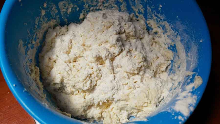 Intr-un bol cernem faina impreuna cu praful de copt si sarea. Adaugam laptele batut si framantam usor aluatul. Daca este nevoie, poti sa mai adaugi apa sau faina, in functie de cat de gros sau subtire este aluatul.