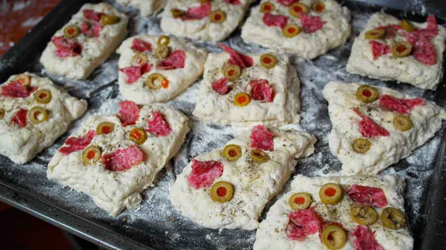 Se transfera apoi aluatul pe blatul de lucru presarat cu faina. Se intinde intr-o foaie dreptunghiulara de aproximativ 2 cm grosime si se taie cu un cutit in bucati mai mici. Fiecare bucata de aluat se unge cu ulei si se pune deasupra salam si masline, iar la final se presara ierburi aromatice. Se pun pizzetele intr-o tava tapetata cu hartie de copt.