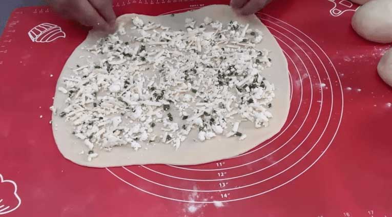In acest timp se pregateste umplutura, se rade branza tare pe razatoarea mare, se adauga peste branza si se toaca marunt ceapa verde. Se amestecă totul, umplutura este gata.