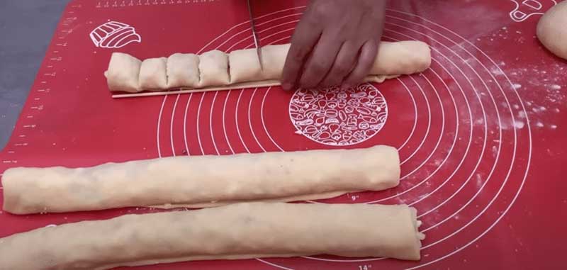 Înfășurați-o într-un rulou, apoi puneți bete de frigăruie pe ambele părți ale ruloului, așa cum puteti vedea în fotografie si crestati cu un cuțit.