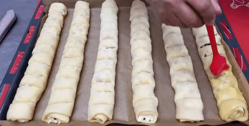 Împărțiți aluatul în 6 părți egale, rulați-l în forma de bila și întindeți-l într-un strat subțire, întindeți umplutura uniform pe întreg stratul.