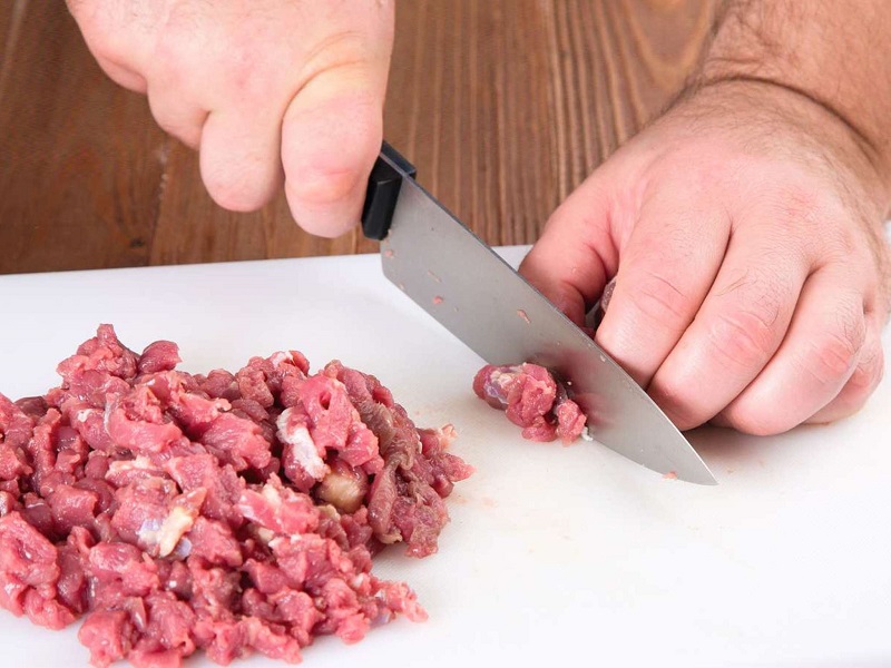 Tocați bine carnea și amestecați-o cu ceapa tăiată, cu sare și piper.