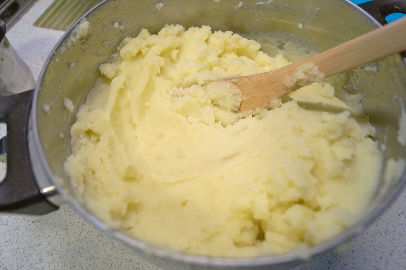 Cartofii fierți se decojesc, se pun intr-un bol adânc, se pisează în piure și se amestecă cu 50 grame de unt.