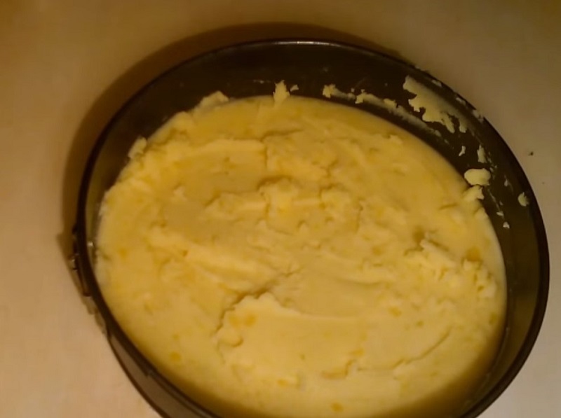 Se toarnă o jumătate din piureul de cartofi în formă și se nivelează bine.