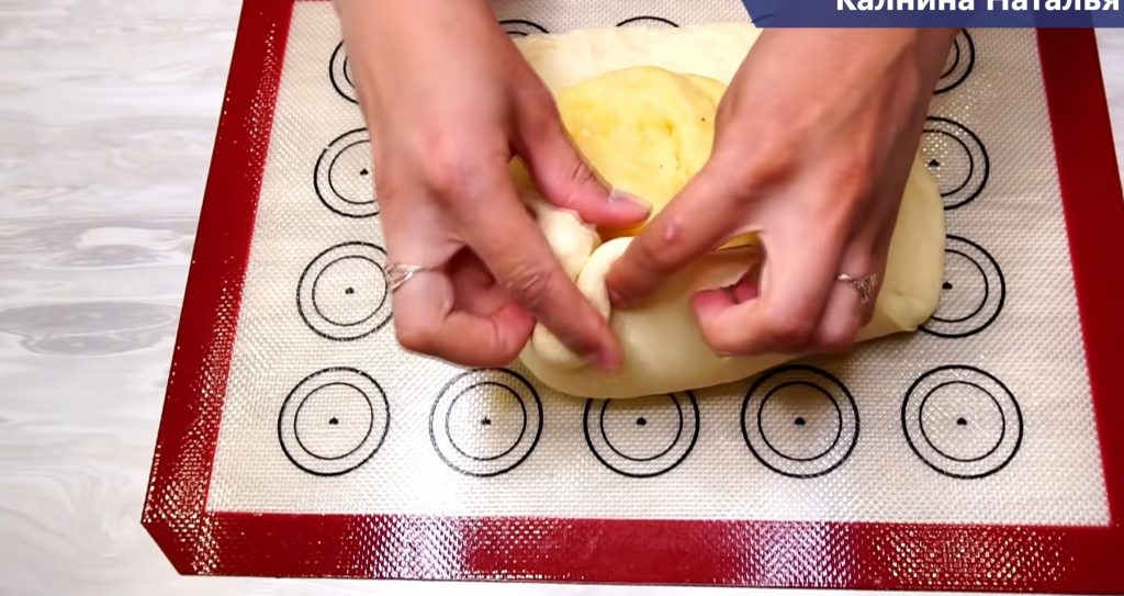 Transferăm aluatul pe suprafața de lucru presărată cu un pic de făină și îl întindem într-o foaie rotundă de 30 cm în diametru. Punem umplutura la mijloc și lipim marginile peste umplutură. Întoarcem plăcinta pe cealaltă parte și o întindem, cu mâna, la un diametru de 30 cm.