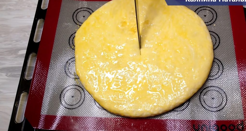 Transferăm plăcinta pe o tavă tapetată cu hârtie de copt, o unge cu gălbenușul bătut cu 1 lingură de lapte și facem o mică tăietură la mijloc.