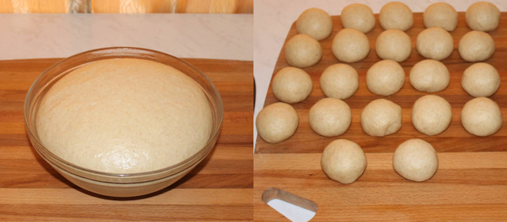 Cand aluatul a crescut, il transferam pe blatul de lucru presarat cu faina si-l taiem in 22 de bucati egale. Din fiecare bucata de aluat facem cate o bila. Acoperim apoi bilele cu o folie si le mai lasam putin sa creasca.