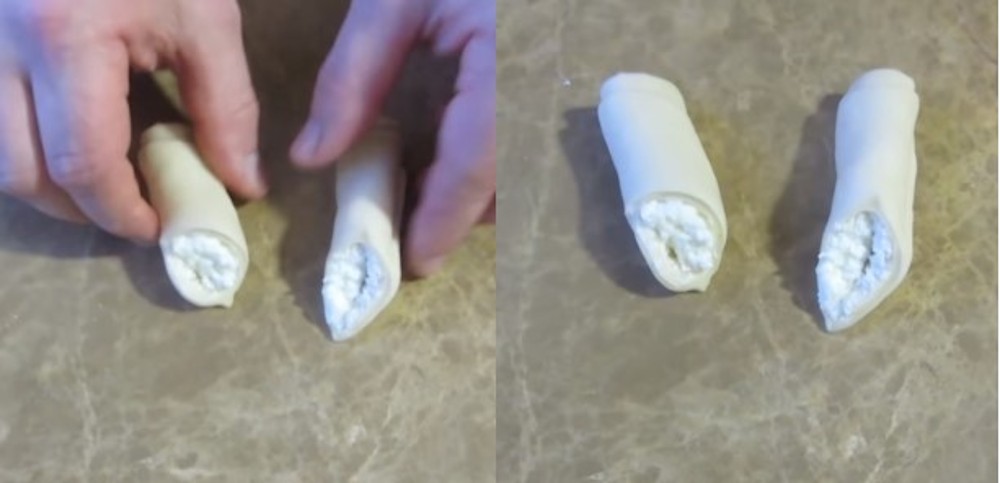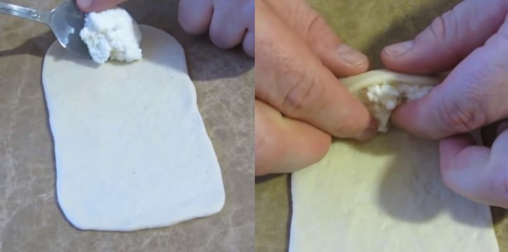 Intindem o bila de aluat intr-o foaie dreptunghiulara. Punem intr-un capat o lingurita de umplutura si rulam aluatul, apoi il taiem in jumatate pe diagonala. Repetam procedeul si cu celelalte 20 de bucati de aluat (una o pastram pentru final).