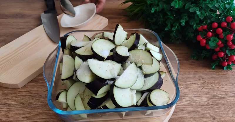 Spală vinetele și taie-le feliuțe subțiri. Presară peste ele o linguriță de sare, amestecă bine, acoperă-le cu folie plastic și lasă-le să stea timp de 30 de minute.