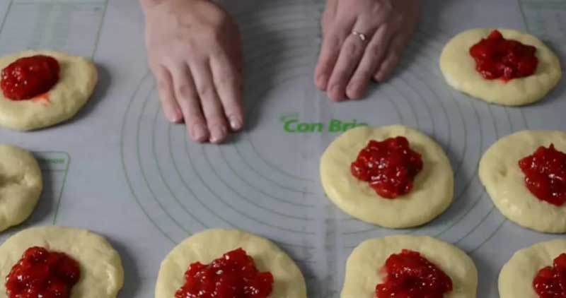 Împart aluatul în bucăți, am obținut 12, fac bile, acopăr cu folie de plastic timp de 10 minute. Apoi intind foi mici din fiecare bila, pun umplutura de căpșuni.