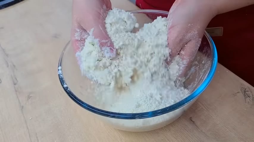 Punem făina într-un bol și adăugăm 20 grame de zahăr și 12 grame de sare. Amestecăm bine și adăugăm și untul… Amestecăm cu mâinile, până obținem textura unui aluat fraged…