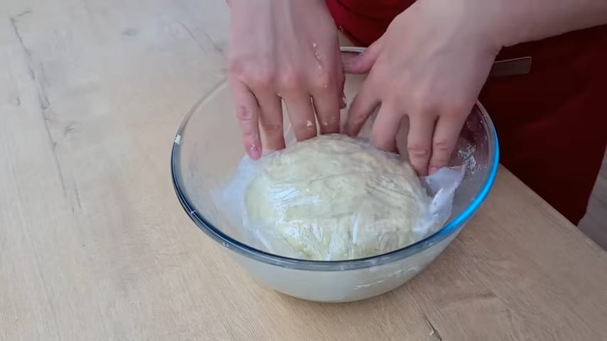 Mixăm separat oul cu 150 ml de iaurt turcesc. Adăugăm peste aluat, împreună cu amestecul de drojdie. Amestecă din nou cu mâinile… După 2 minute de frământat, lăsăm aluatul la odihnit (acoperit cu folie alimentară).
