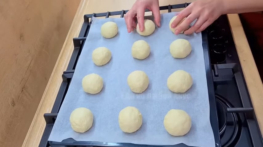 Împărțim aluatul în bucăți egale. Le așezăm în tavă, lăsând suficient spațiu între ele…