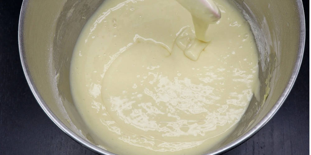 Turnam apoi laptele si uleiul de floarea soarelui. Amestecam bine si adaugam zeama de la jumatate de lamaie. La final, adaugam faina cernuta cu praful de copt si amestecam pana obtinem un aluat cu densitate medie.