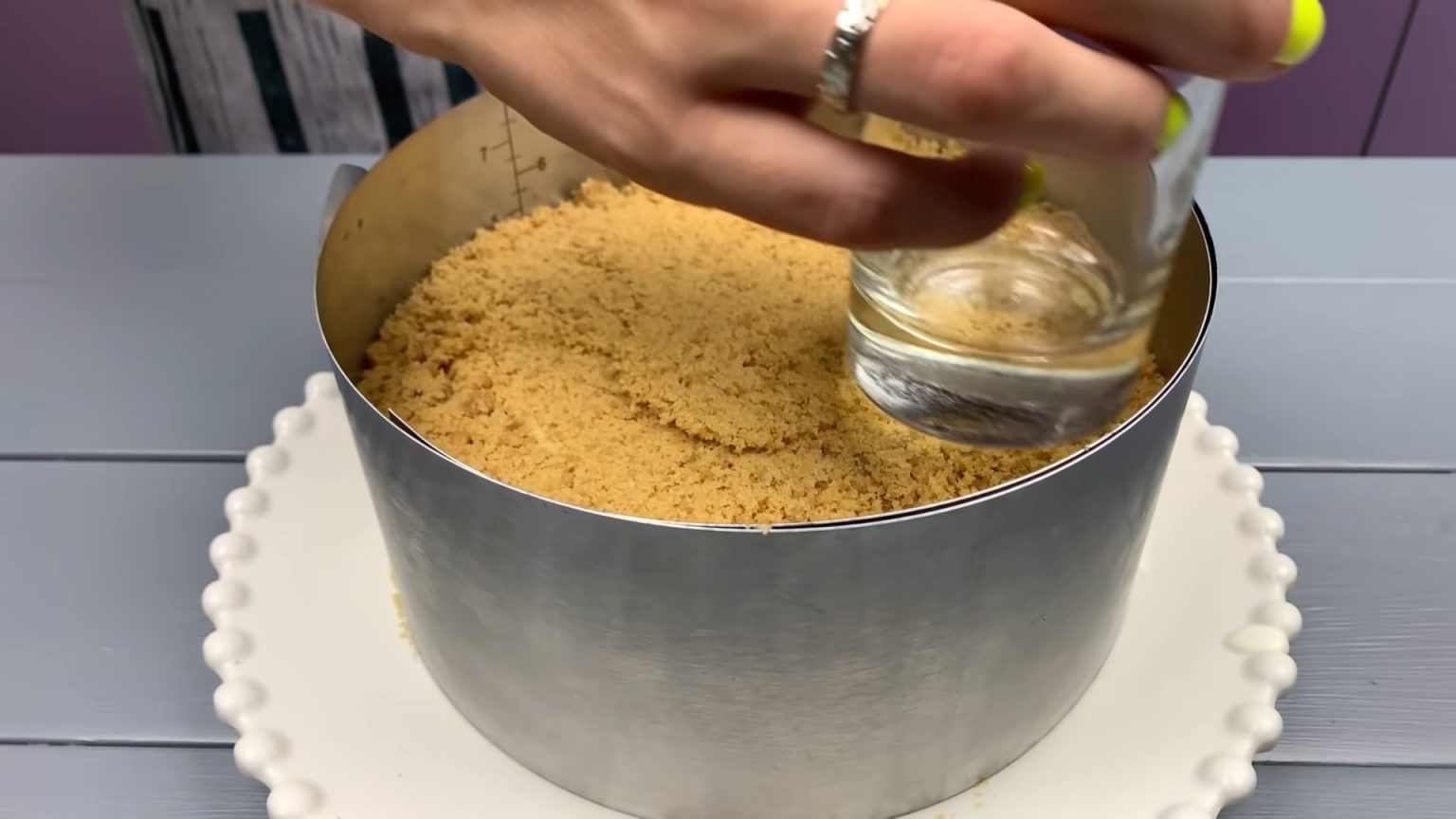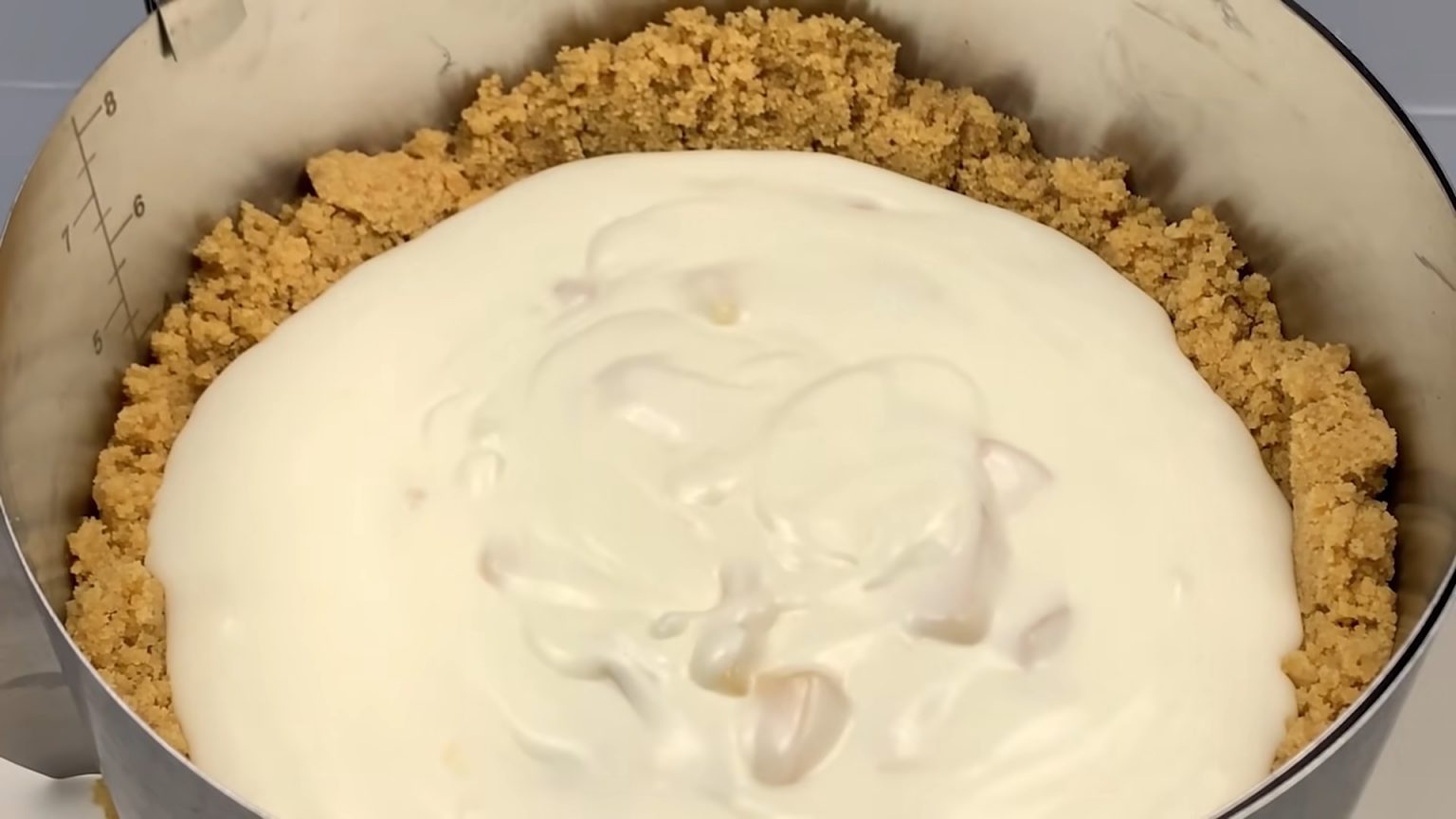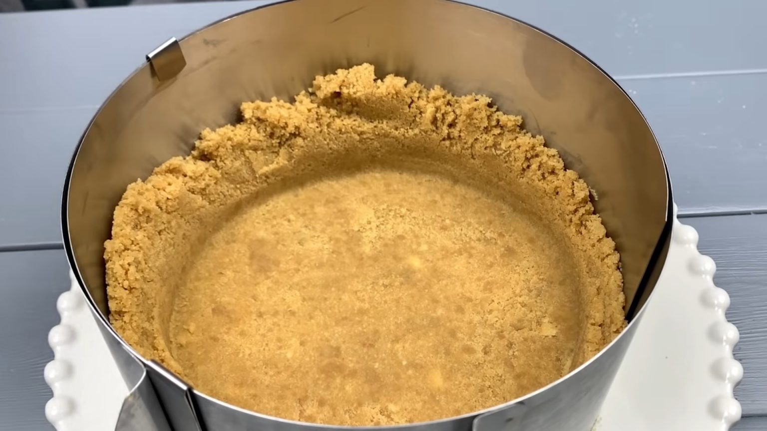 amestecăm biscuiții măcinați cu untul topit. Transferăm jumătate din acest amestec într-o tavă de 18 cm și formăm un blat uniform. Dăm tava la frigider.