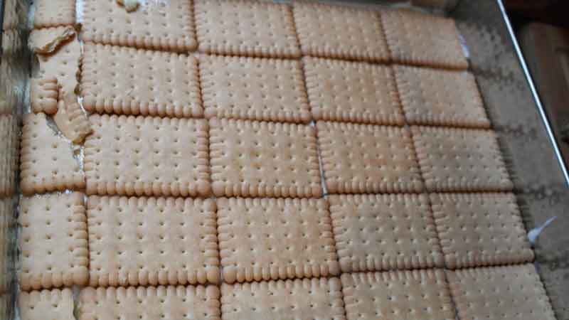 Intr-o tava (25×30 cm) tapetata cu hartie de copt, punem biscuitii cu jeleu si glazura de ciocolata. Intr-un pahar cu apa dizolvam jeleul de lamaie si amestecam bine.