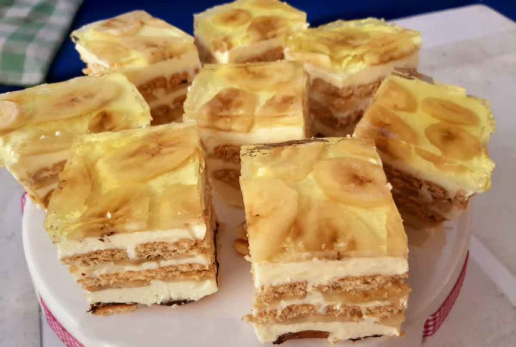 Prajitura cu banane si biscuiti este atat de buna incat ai putea sa o mananci in fiecare zi. Nu trebuie sa astepti un eveniment special pentru a pregati aceasta reteta. Incearc-o chiar acum si incanta-ti papilele gustative cu un desert delicios!