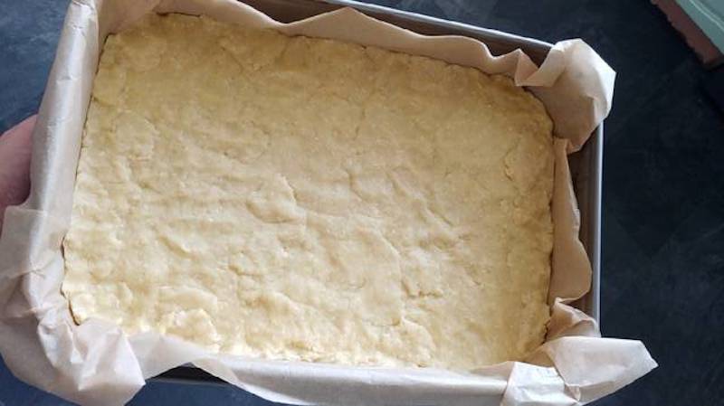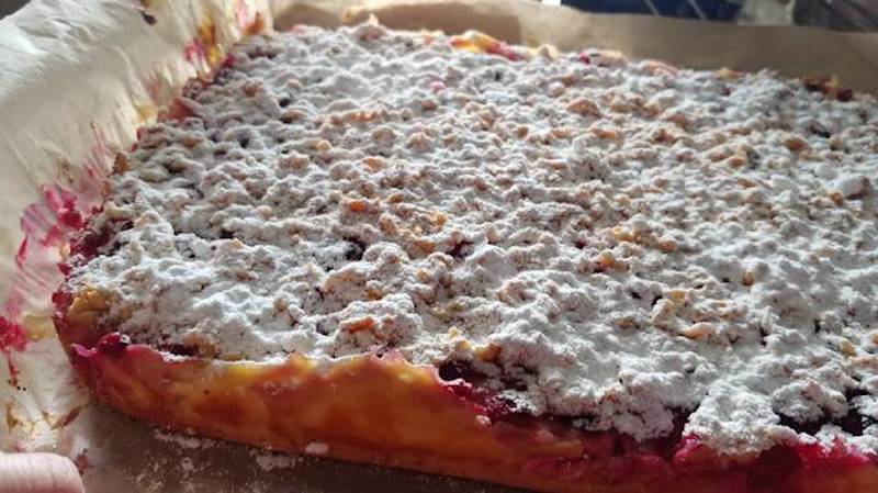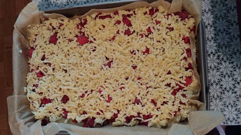Turnam budinca peste blatul copt, apoi adaugam coacazele rosii. Scoatem aluatul ramas in congelator si-l dam prin razatoare. Presaram aluatul ras peste fructe.