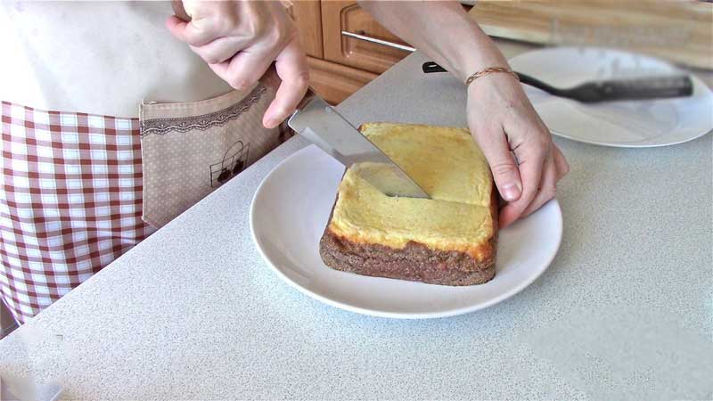 După ce prajitura s-a răcit puțin, acoperiți forma cu o farfurie de dimensiuni potrivite și răsturnați-o cu grijă pentru a transfera desertul pe farfurie. Astfel, va arăta mult mai atractivă decât în formă. Tăiați prajitura în porții și serviți.