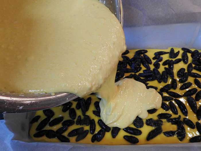 Tapetam o tava cu hartie de copt si intindem aluatul uniform in ea. Ne ajutam de o lingura sau o spatula. Intindem afinele proaspete pe aluat.