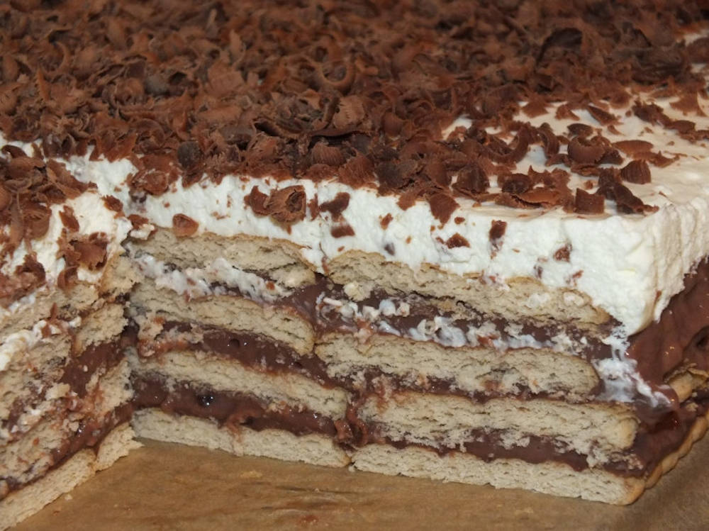 Tapeteaza o tava dreptunghiulara (25 x 36 cm) cu hartie de copt. Pune pe fundul tavii un strat de biscuiti (aproximativ 26 bucati). Toarna peste biscuiti 1/3 din budinca de ciocolata calda. Acopera cu un nou strat de biscuiti si toarna din nou jumatate din budinca ramasa.Pune al treilea strat de biscuiti deasupra si intinde budinca ramasa. Niveleaza frumos si adauga ultimul strat de biscuiti. Lasa prajitura sa se raceasca.