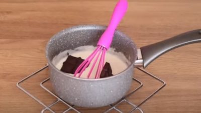 Puneți prăjitura la frigider și lăsați-o să se răcească. Între timp, turnați smântâna pentru frișcă într-o oală, încălziți-o și adăugați ciocolata ruptă în bucăți.