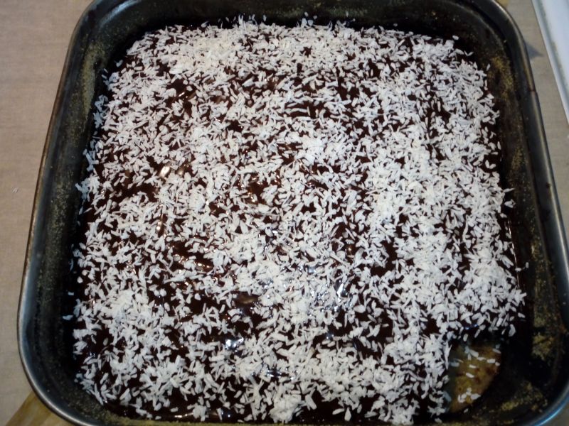Incalzeste laptele si toarna-l peste ciocolata rupta in bucatele. Amesteca usor. Toarna glazura obtinuta peste blatul rece. Presara deasupra fulgi de nuca de cocos.