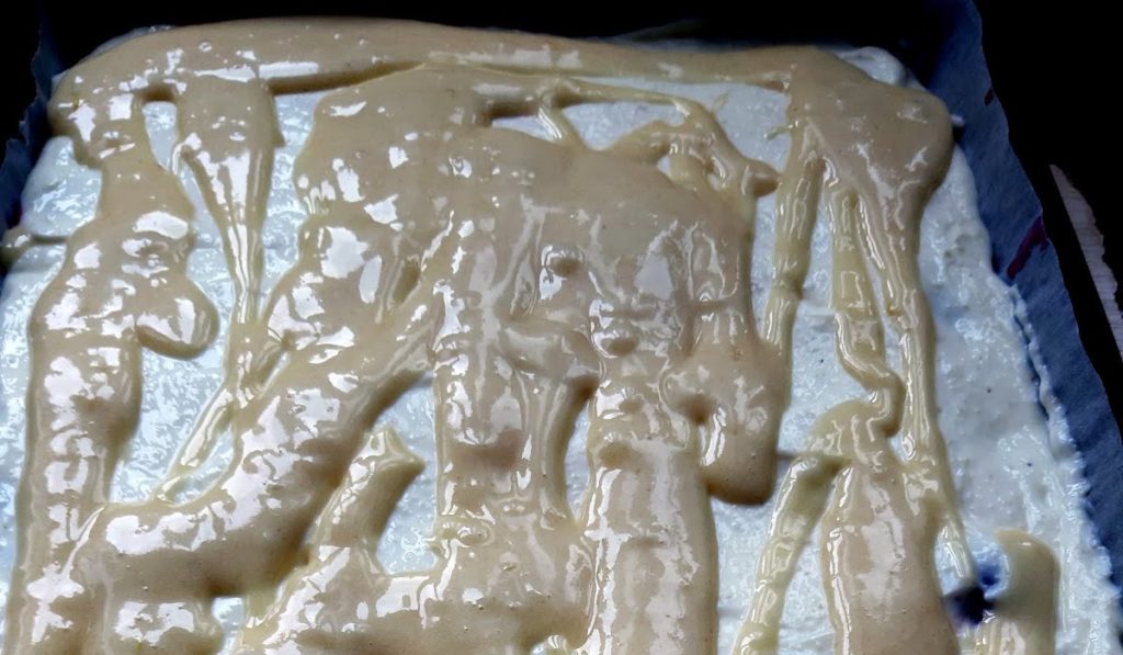 Tapetăm o tavă de 35*25 cm cu hârtie de copt, turnăm în ea jumătate din compoziția pentru blat și nivelăm. Dăm tava la cuptorul preîncălzit pentru 15 minute.