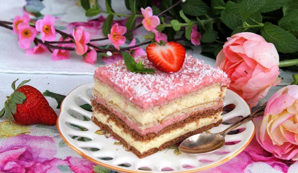 Pentru a prepara crema de capsuni, batem smantana dulce cu zaharul pudra pana obtinem o spuma ferma. Zrobim capsunele cu un blender si le adaugam in crema. Dizolvam jeleul in apa fierbinte. Il lasam putin sa se raceasca apoi il adaugam in crema de capsuni. Punem crema de capsuni la frigider pentru cateva minute.Pe fundul unei tavi patrate punem un strat de biscuiti de cacao. Deasupra adaugam jumatate din umplutura de branza. Acoperim cu un nou strat de biscuiti de cacao. Intindem jumatate din crema de capsuni deasupra si acoperim cu biscuti de vanilie. Adaugam umplutura de branza ramasa si punem ultimul strat de biscuiti de vanilie.