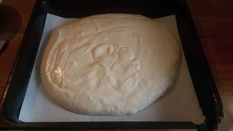 Turnați aluatul într-o tavă tapetată cu hârtie de copt, uniformizați și coaceți în cuptorul preîncălzit la 180 de grade Celsius timp de aproximativ 15-20 de minute.