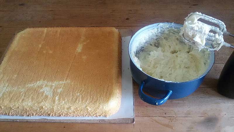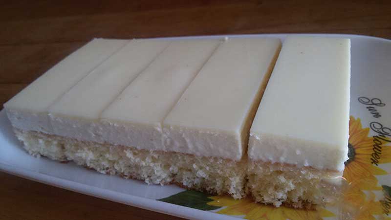 Întindeți uniform crema peste aluatul răcit și acoperiți cu ciocolata albă topită.