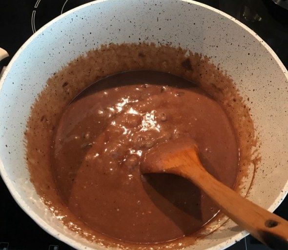 amestecăm laptele cu bucățelele de ciocolată și fierbem până se topește ciocolata de tot, amestecând continuu, apoi luăm de pe foc și lăsăm să se răcească.
