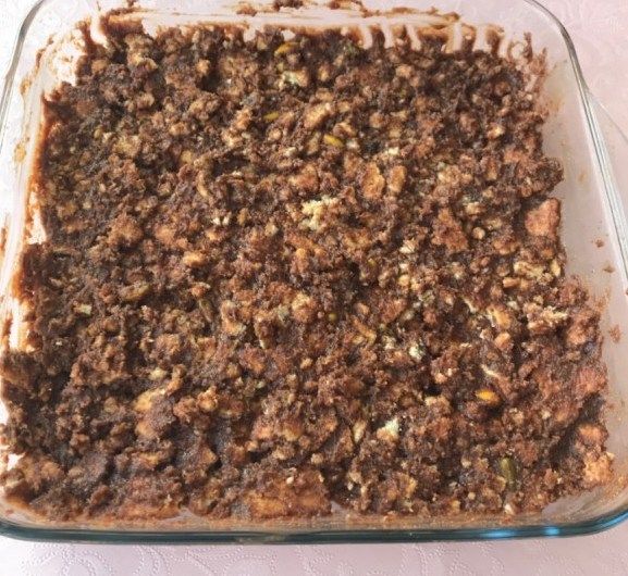 Amestecăm bine, apoi întindem uniform, apăsând cu o lingură.