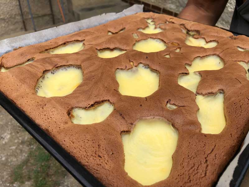 Turnăm aluatul într-o tavă tapetată cu hârtie de copt și adăugăm crema de budincă deasupra, chiar dacă aluatul este cald.