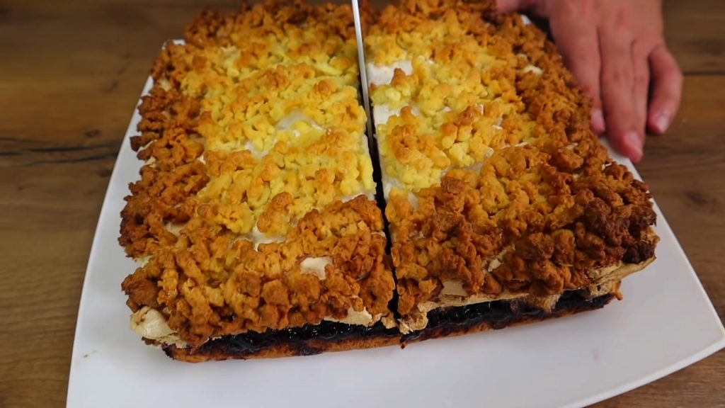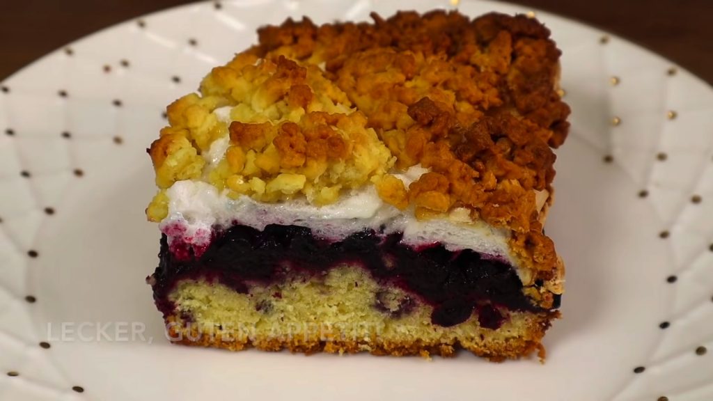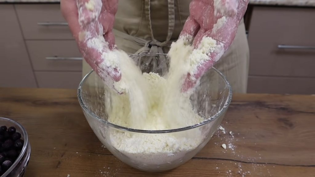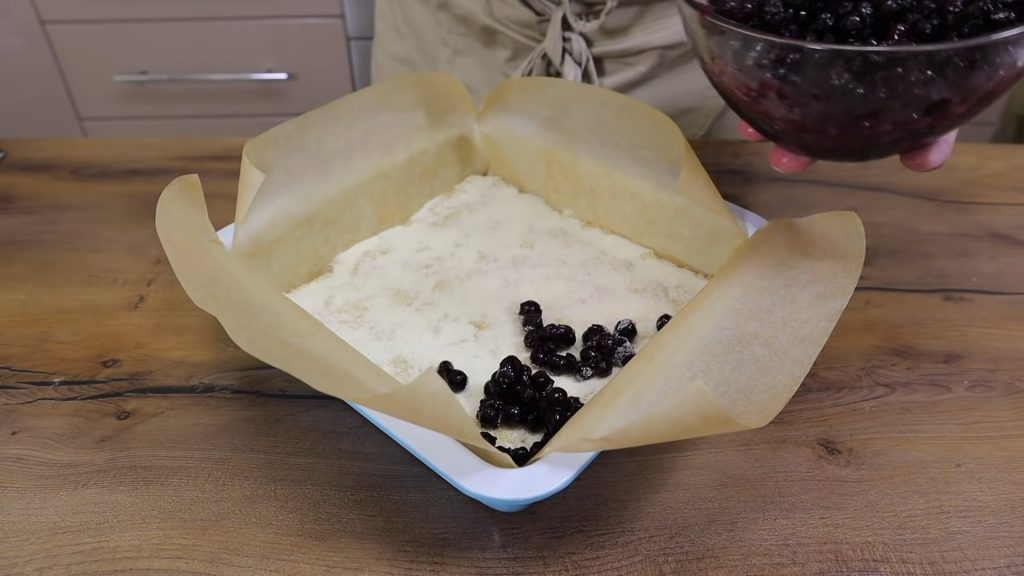 Prăjitură la tavă cu fructe și aluat răzuit – Aveți nevoie de 250g făină, 3 ouă, 100g unt, 50g zahăr pudră, 300g afine și…