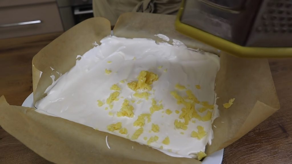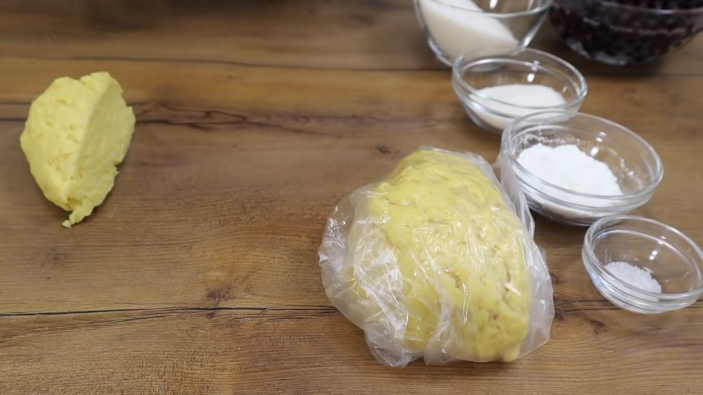 Încorporăm fulgii de cocos în aluatul mai mic, îl împachetăm în folia alimentară și îl dăm la congelator. Împachetăm și aluatul mai mare în folie și îl dăm la frigider până pregătim umplutura.