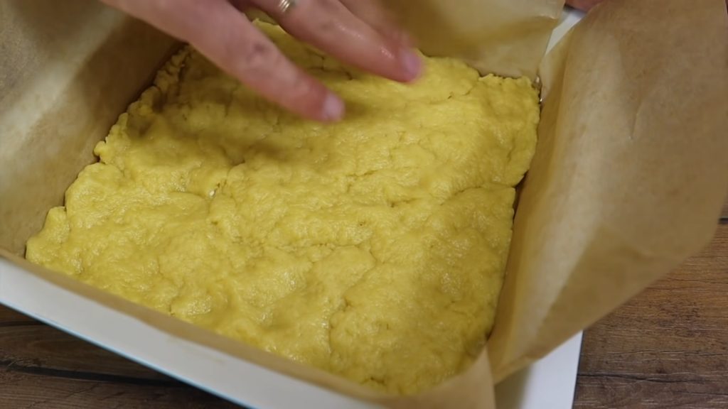 Pentru aluat, cernem făina, zahărul pudră și praful de copt într-un bol. amestecăm, adăugăm vanilia, untul moale și amestecăm cu mâna până obținem un aluat nisipos.