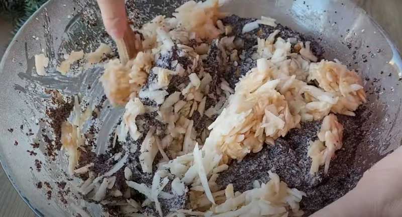 Adăugați amestecul de mac răcit, coaja de portocală confiată, nucile tocate și uleiul de migdale. Amestecați bine.