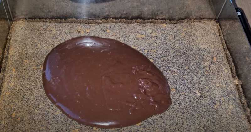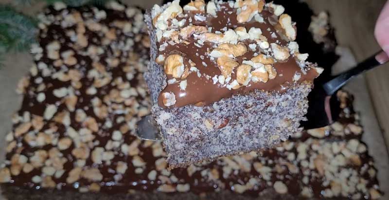 După ce prăjitura s-a răcit complet, turnați glazura de ciocolată deasupra și presărați nuci tocate pentru decor.