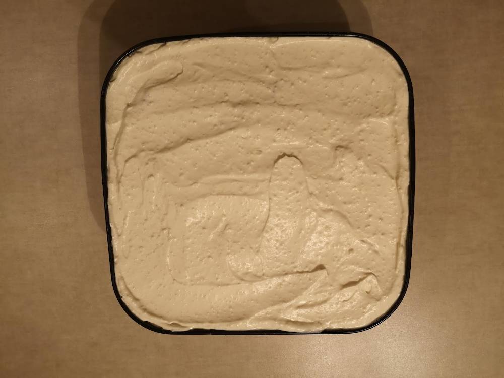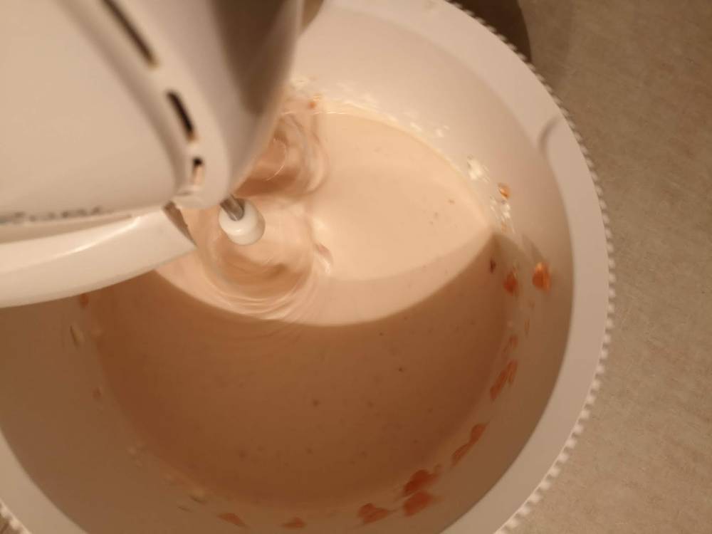 Acum pregatim crema de mascarpone. Batem smantana dulce cu mixerul. Adaugam branza mascarpone si amestecam bine.