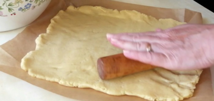Acum luăm aluatul și îl împărțim în două părți inegale. Întindem partea mai mare a aluatului pe hârtie de copt conform dimensiunii tavei, luând în calcul și marginile. Tava mea are dimensiunile 20×26 cm.