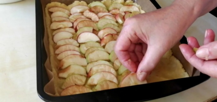 Așezăm aluatul întins pe hârtia de copt în tavă și formăm margini cu o înălțime de 1,5-2 cm. Așezăm peste aluat felii de mere. Noup ne place să avem multă umplutură, așa că nu facem la mere.