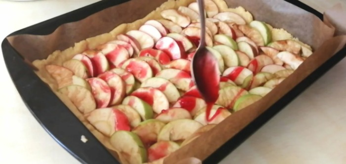 Pentru un gust mai interesant al umpluturii, am decis să torn peste mere sirop de zmeură, dar acesta nu este obligatoriu.