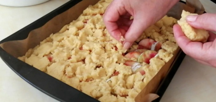 Pentru ca partea de sus a plăcintei să arate frumos, iau restul de aluat și rup din el bucăți mici pe care le așez peste umplutură.