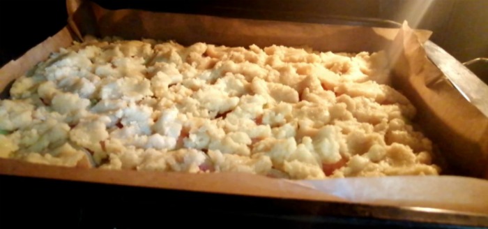 Punem acum plăcinta noastră în cuptorul preîncălzit la 180 de grade Celsius pentru 30-35 de minute. Folosesc ambele elemente de încălzire și convecție. Dacă nu aveți convecție – nu e o problemă, doar că plăcinta va coace puțin mai mult.
