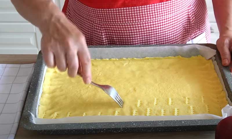 Întindeți aluatul în formă, ridicând marginile cu aproximativ un centimetru. Înțepați aluatul cu o furculiță.