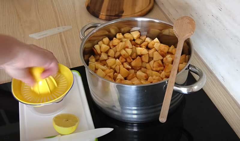 Tăiați merele cubulete și puneți-le într-o oală, adăugați 50 ml apă și 50 ml suc de lămâie.