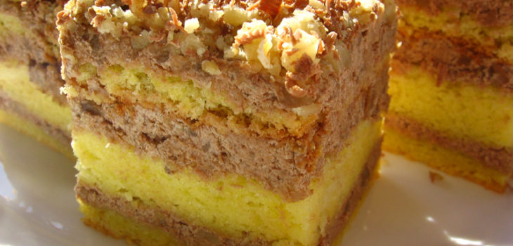 Acoperiti cu cea de-a treia foaie de aluat si intindeti ultimul strat de crema. Se decoreaza cu nuci macinate si fulgi de ciocolata.