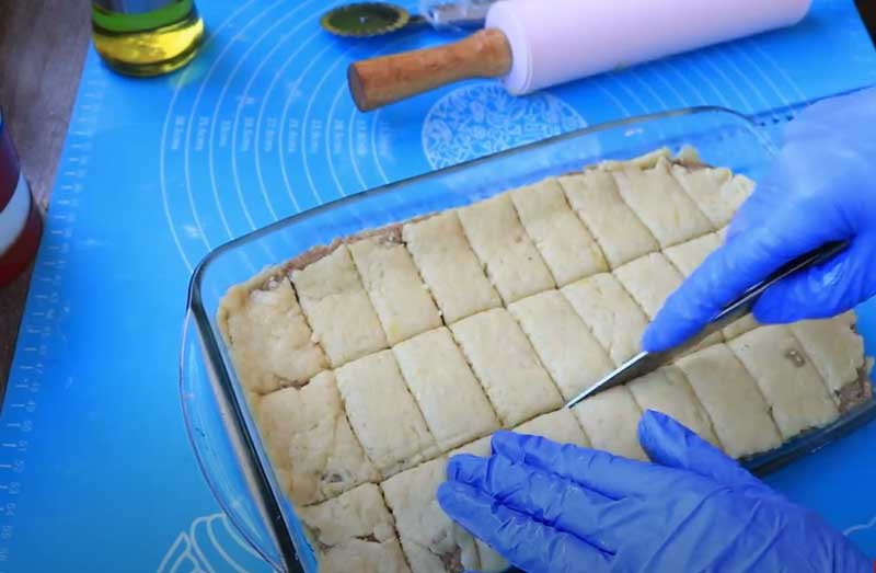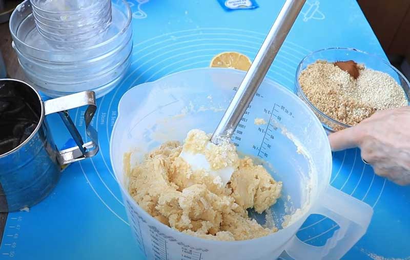 Întindeți prima jumătate de aluat la dimensiunea tăvii și așezați-l pe fundul acesteia. Amestecați nuca măcinată cu zahărul pudră, susanul, scorțișoara și smântâna, apoi încorporați bucata mică de aluat păstrată. Frământați bine cu mâinile pentru a obține o compoziție omogenă.
