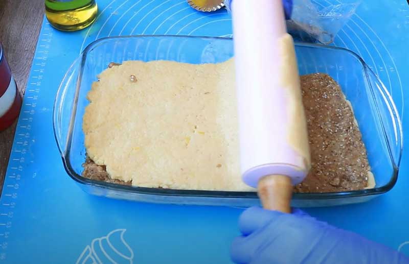 Asamblarea straturilor: Puneți stratul de umplutură deasupra primului strat de aluat din tavă și întindeți uniform. Acoperiți umplutura cu al doilea strat de aluat, întins tot la dimensiunea tăvii.